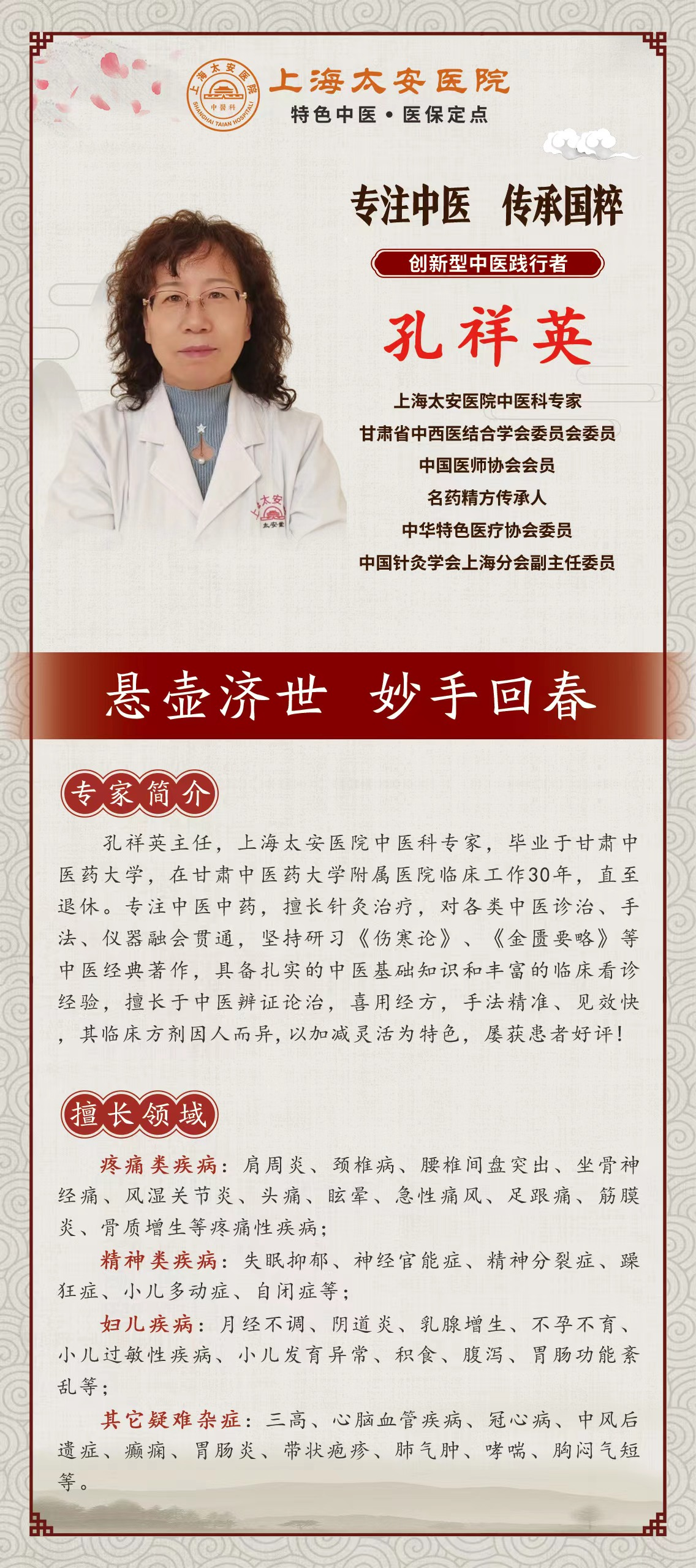 孔祥英不仅擅长针灸治疗,对各类中医诊治、手法、仪器融会贯通,而且她是一位全面发展的医生!她在工作中从未停止自己的学习,充实自己的理论基础和临床实践。除了疼痛类疾病在精神类疾病和妇儿疾病过程中,她也能够灵活应对各种问题,拥有丰富且独特的经验。